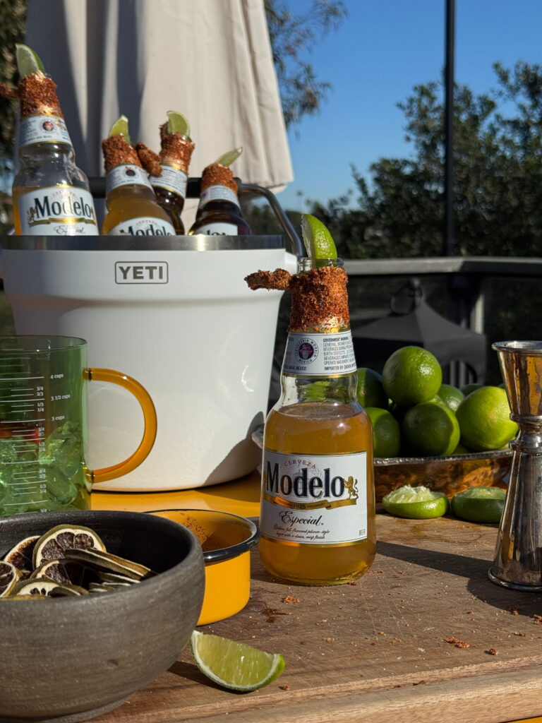Start with a six-pack of your favorite Mexican beer and make sure all the ingredients are fully chilled. Lukewarm beer is a hard no. Open each beer and carefully pour out about 4 oz from each bottle to create room. Let’s see… 4oz. x 6 beers = 24 oz. of extra beer. Maybe nurse the extra beer until everyone arrives for the party? Idk. Use your best judgement.