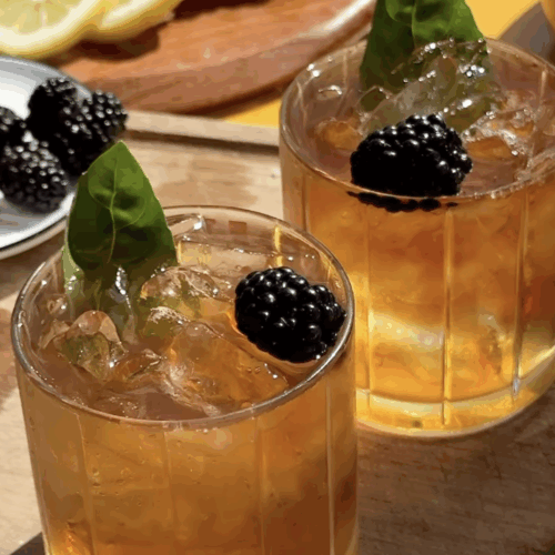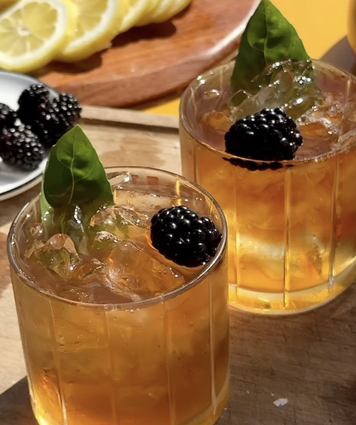 The mix of tart lemonade and strong black tea is classic, but adding muddled blackberries and basil gives it depth, color, and just the right amount of flair. It’s not overly sweet, and the basil brings a garden-fresh edge that makes it feel a little elevated.