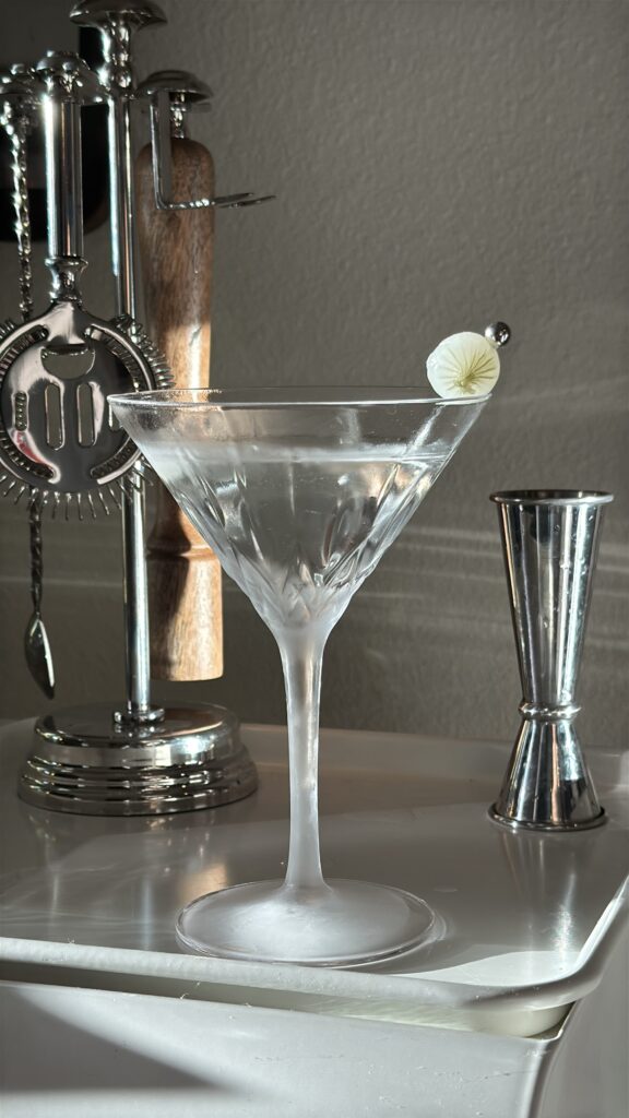 Dirty Martini with pickled onions instead of olives. (This was chess-genius Beth Harmon’s signature drink in A Queen’s Gambit!)